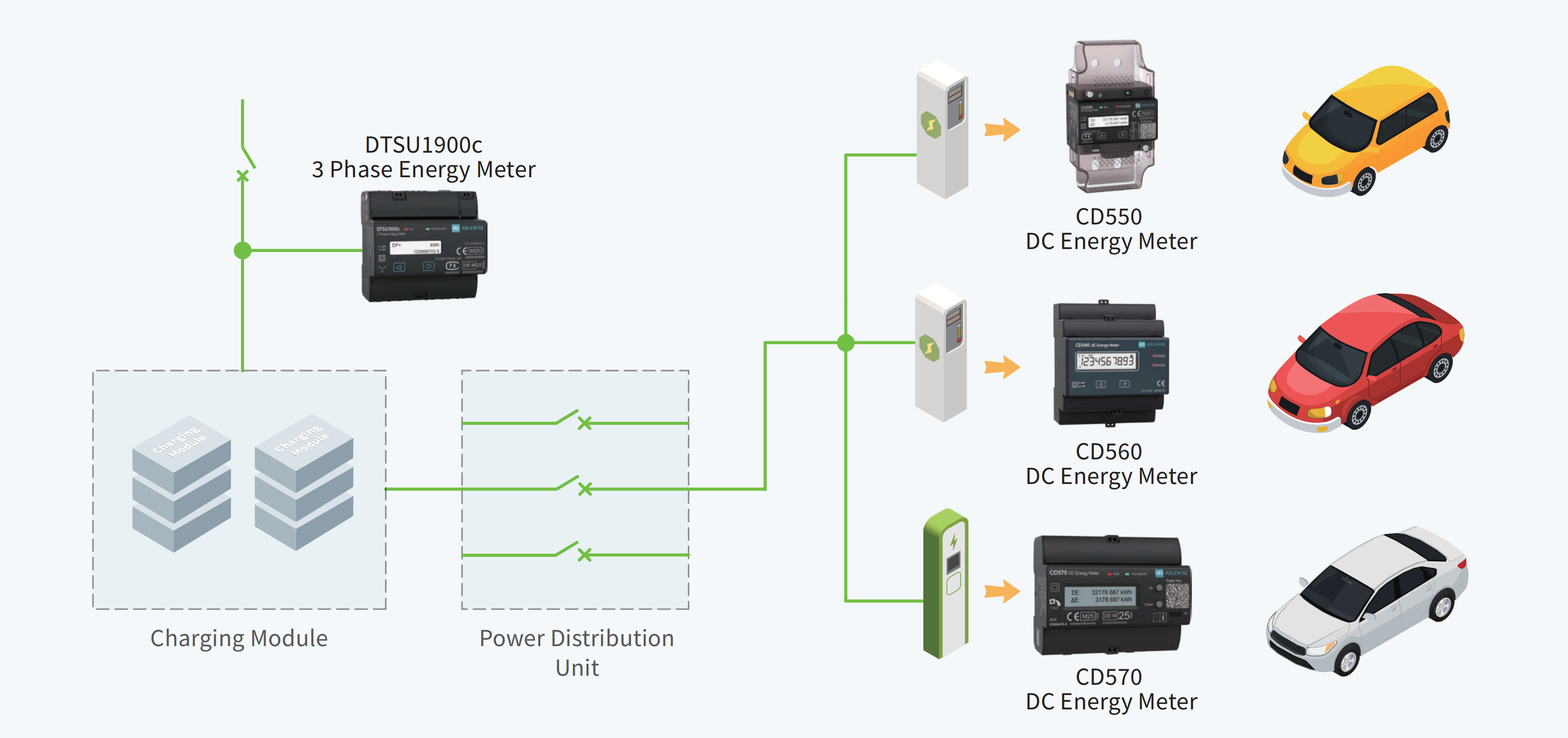 Distributed charging stack is a large-scale DC charging device that works together with multiple charging modules to meet the charging needs of large-scale electric vehicles. The entire system is divided into three main levels: power pool layer, intelligent allocation layer, and charging terminal layer. The AVM29/DTSU1900c three-phase AC meter can be used on the input side for AC monitoring and measurement; Each charging terminal can use DC meters CD550, CD560, CD570, and CD580 to meet the billing needs of different powers and certification requirements.